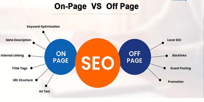 On/Off Page SEO improves website ranking. On-page focuses on content and structure, while off-page builds backlinks and authority from external sources like other websites.